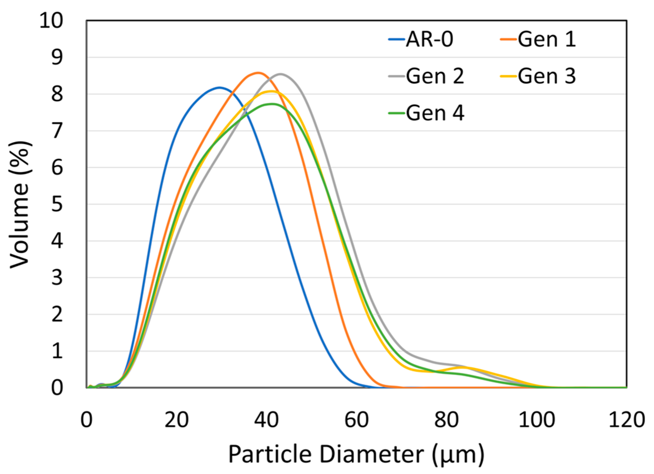 A significant change in particle size distribution occurs with increasing spray-recovery cycles: the fraction of large particles (>20 microns) decreases steadily, while the proportion of fine particles increases. This trend is reflected in the d90, which decreases from 28.8 µm down to 14.5 µm between AR-0 and Generation 4. The d50 follows a similar trend, from 11.2 µm to 7.3 µm, while the d10 remains nearly constant.