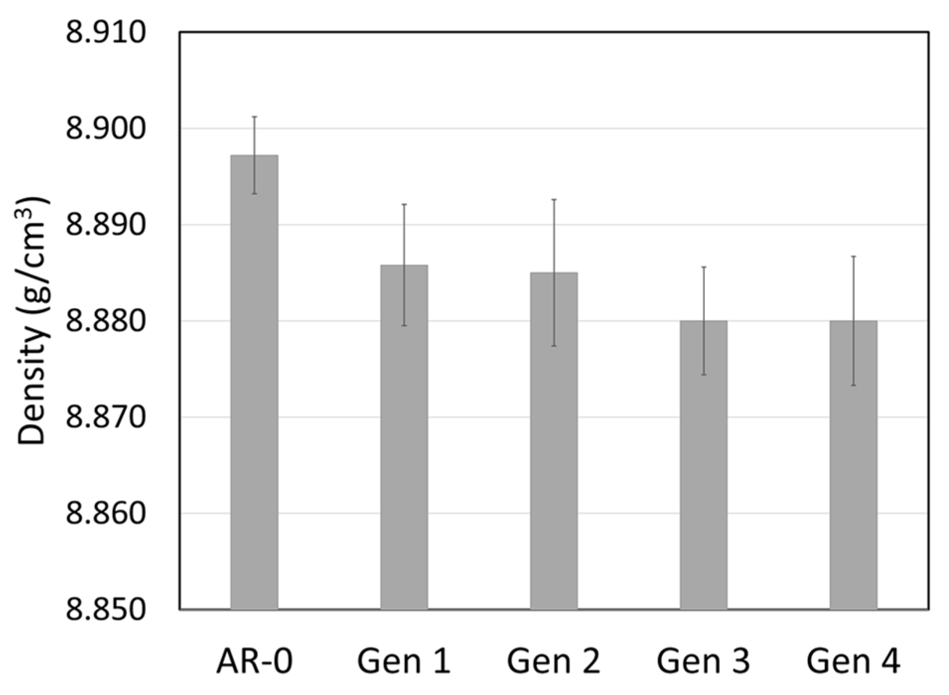 Figure 7). Powder density decreases slightly with the number of cycles, while the hardness increases significantly from just above 150 HV for AR-0 to nearly 200 HV for Generations 2 to 4.