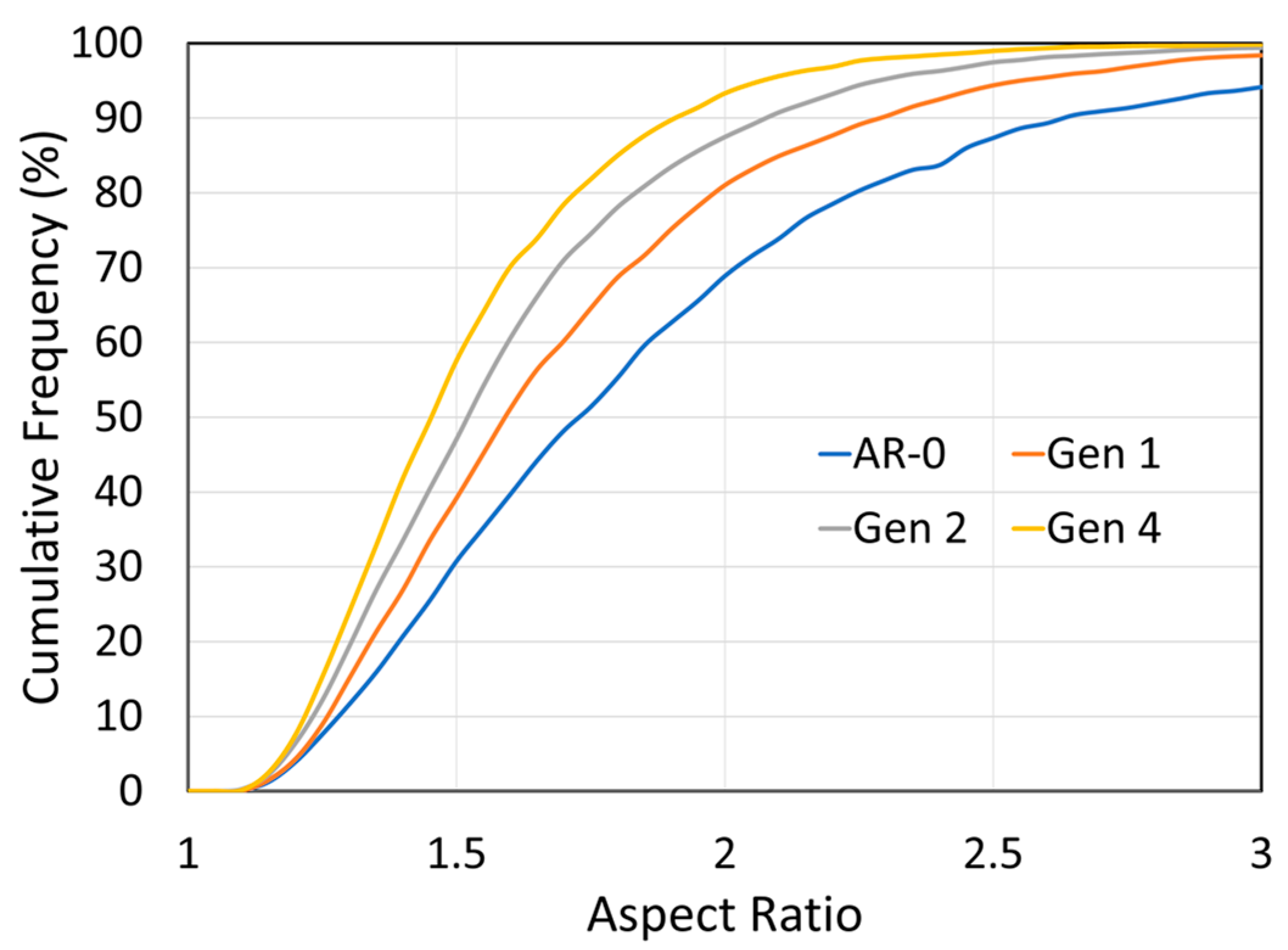 Figure 5 shows that most particles are relatively equiaxed, with 70% having an aspect ratio below 1.3 and 90% below 1.5. A marked change occurs after the first spray-recovery cycle, with nearly 50% of particles exhibiting aspect ratios above 1.5, highlighting a clear morphological shift. As the generation number increases, the aspect ratio continues to rise slightly but stabilizes from Generations 3 to 4.
