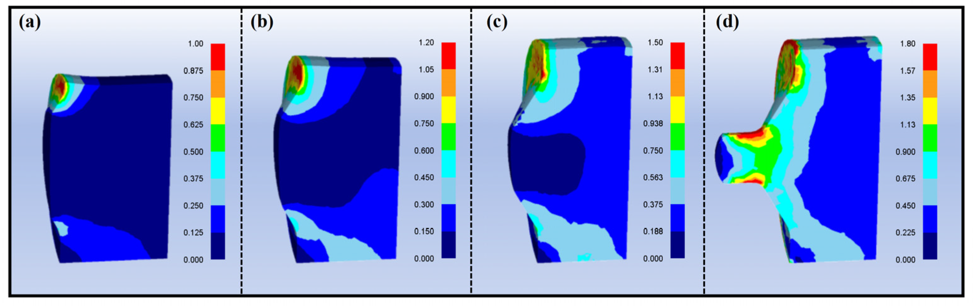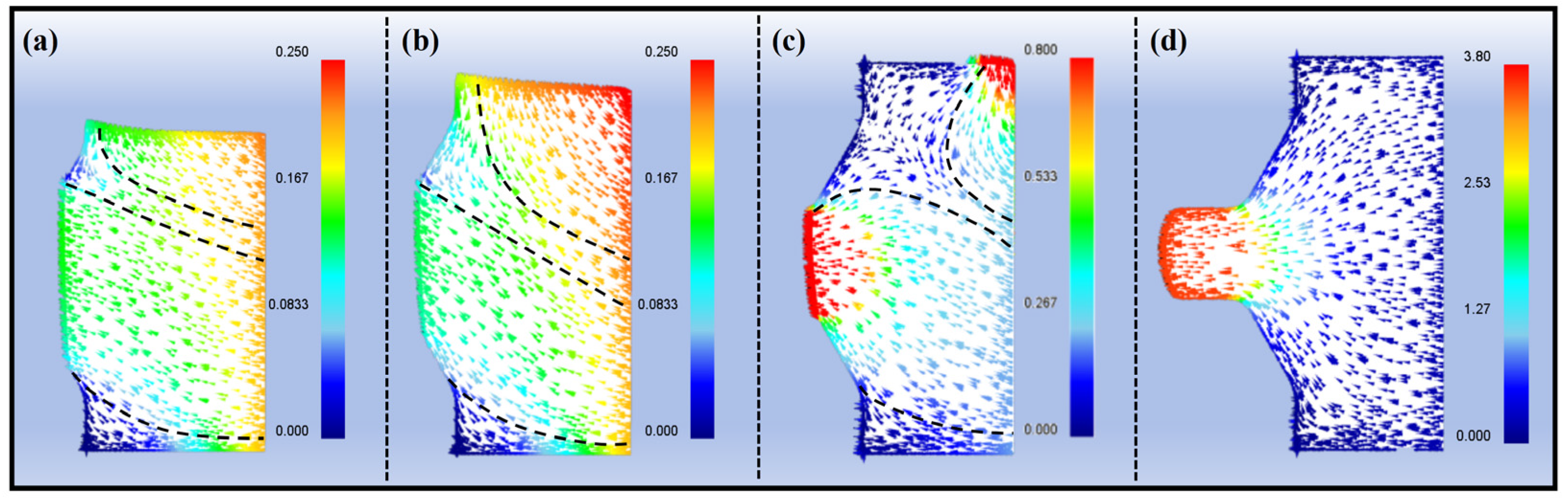 - Finite element simulation reveals a unique shear deformation mode during the asymmetric upsetting–filling stage. Under the combined effects of gravity and die constraints, the billet undergoes intense asymmetric shear strain and flow, which introduces high deformation stored energy in advance. This lays the foundation for subsequent DRX nucleation and texture evolution during subsequent deformation.