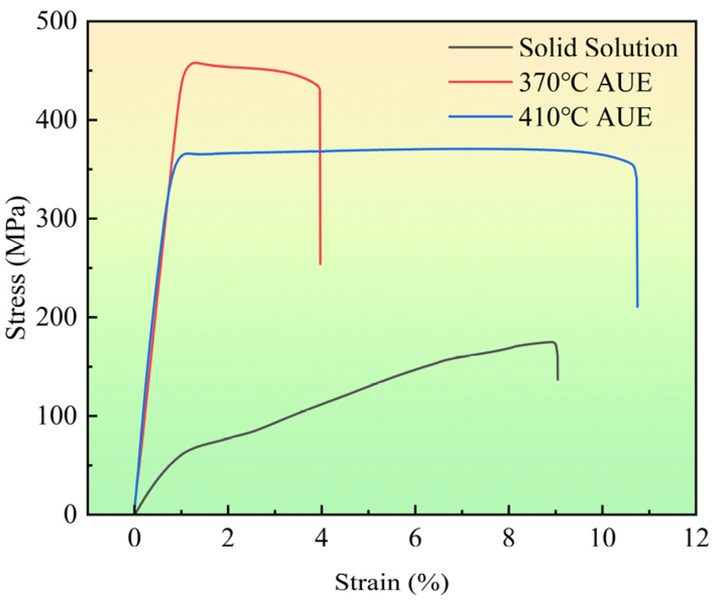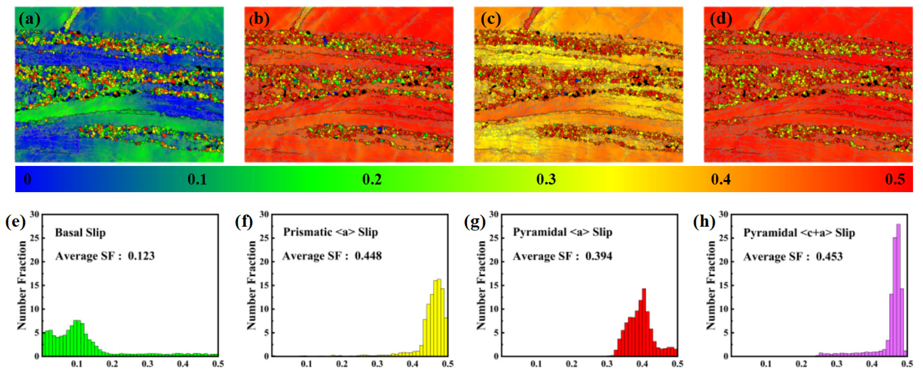 - The strong <10-10>//ED basal fiber texture is one of the key factors responsible for the high strength and low ductility of the AUE370 alloy. This texture strongly inhibits the activation of basal slip (average SF merely 0.123) and forces plastic deformation to rely on harder-to-activate non-basal slip systems.