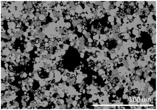The density of the obtained discs determined by the Archimedes method is 8.88 g/cm3, which in comparison to the theoretical value of 10.43 g/cm3 determined for the W0.75Zr0.25B2 compound with the P63/mmc (194) structure [33] gives a porosity of the order of 15%. Considering that the sinters were made with an excess of 2.5 of (TMB2.5) boron instead of 2 (TMB2), and the theoretical calculations used a stoichiometric value of 2, the theoretical density values are overestimated due to the atomic mass of boron (10.8) being significantly lower than the masses of the other components. Reducing the theoretical density also reduces the porosity below 10%.