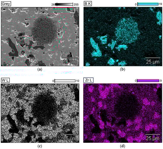 EDS maps of exemplary SPS-ed target sample (W0.76Zr0.24B2.5) (a) SEM micrographs, (b) boron, (c) tungsten, (d) zirconium distribution.