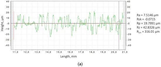 The surface roughness was examined using a Talysurf stylus scanning profilometer (Taylor Hobsson, Leicester, UK), in accordance with the standard method. This enabled roughness profiles to be recorded, from which the arithmetic mean deviation from the mean line was calculated. To obtain adequate statistics, five measurements were performed on each sample. Definitions and parameters for the determination of surface texture by profile methods are compliant with the standard ISO 21920-2:2021. Surface roughness was determined as the mean of five measurements per sample.