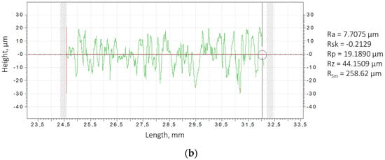 Surface roughness profilograms for steel HS6-5-2 samples after the ESA at discharge energies: (a) 0.36 J, (b) 0.90 J.