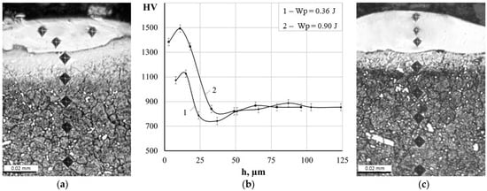 Microstructures (a,c) and microhardness distribution (b) of coatings after ESA at discharge energies: (a) 0.36 J, (c) 0.90 J.