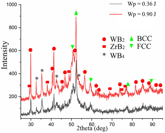 The phase composition of the obtained coatings is more complex than that of the electrode used for deposition (see Figure 9). In addition to the ZrB2 and WB2 binary borides characteristic of the electrode obtained at Wp = 0.36 J, high-boron WB4 phases appear in the surface layer. This indicates more intense mass transfer of the electrode material and diffusion of boron, which becomes saturated in the near-surface zone.