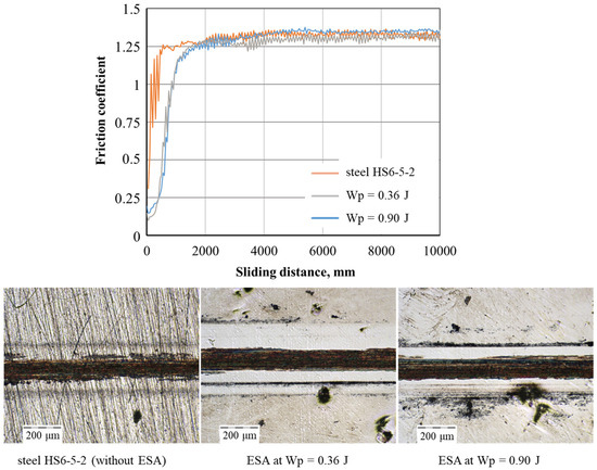 Figure 10 shows the variation in friction coefficient with increasing sliding distance, as well as the wear traces after the reciprocating abrasion test. The friction coefficient for the substrate (HS6-5-2 steel) and the coated samples obtained using the ESA method is approximately 1.2. There is little difference in the friction coefficient between the steel and coatings. This similarity is due to the formation of a stable tribological layer (tribofilm) at the interface where the indenter and the sample come into contact during sliding. This layer equalises the surface energy of the contact area, providing similar dry friction conditions. Furthermore, coatings produced by the ESA method exhibit increased microhardness and a specific structure, which restricts plastic deformation during friction and minimises the risk of adhesive wear.