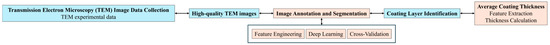 Figure 1 outlines the complete workflow of our method, from data collection to thickness evaluation. The workflow consists of (1) TEM image acquisition, where high-resolution experimental data are collected; (2) image quality control, in which low-contrast or noisy images are filtered to ensure data reliability; (3) manual annotation and segmentation, where shell layers are labeled to generate training masks; (4) deep learning model training and inference, using feature engineering, cross-validation, and optimization strategies; (5) shell layer identification, where the trained model performs automated segmentation on new samples; and (6) thickness evaluation, involving skeleton-based morphological analysis and statistical quantification (e.g., mean thickness, standard deviation, coefficient of variation).