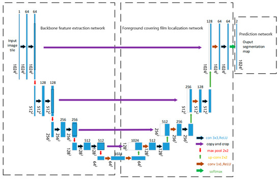 Finally, a 1 × 1 output layer maps the 64-channel feature map to two output channels (foreground and background), followed by a softmax activation to produce the segmentation map.