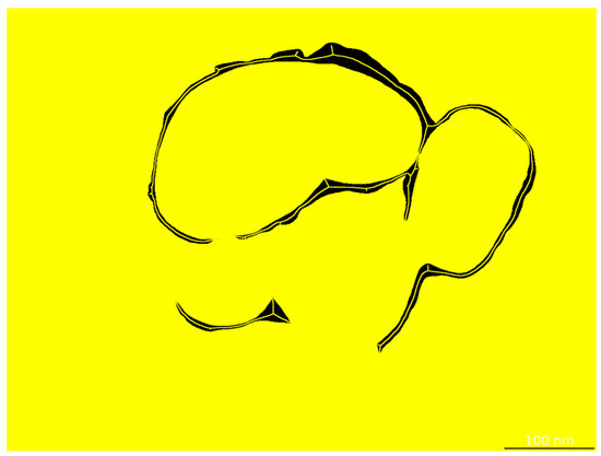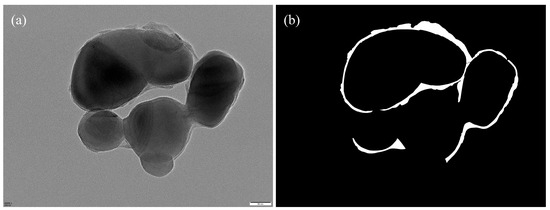 We constructed a standardized TEM image dataset comprising representative core–shell TiO2 samples collected from a vanadium–titanium magnetite steel plant. The original grayscale images were acquired at magnifications of 60,000×, 80,000×, or 100,000×, with dimensions of 5120 × 3840 pixels. Regions of interest—primarily shell layers—were manually annotated by experienced researchers using the Labelme tool, as illustrated in Figure 6, which provides a representative example of the manual annotation process. Annotation was particularly challenging due to complex particle morphologies, overlapping structures, and low-contrast regions common in TEM imaging.