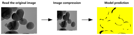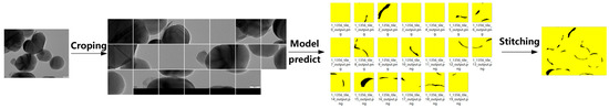 To handle full-resolution TEM images (5120 × 3840 pixels), we evaluated two inference strategies based on the TD U-Net model. Method 1 directly downsamples the original image to 1024 × 1024 resolution, performs segmentation, and then upscales the predicted mask back to its original size (Figure 10).