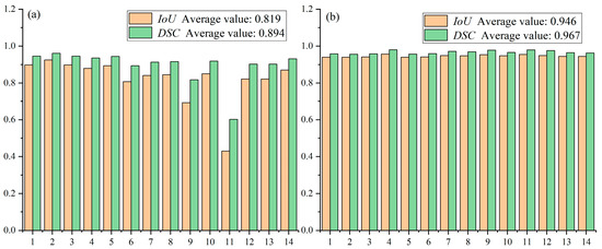 Both IoU and DSC range from 0 to 1, with higher values indicating better segmentation quality. In our experiments, we report both metrics to comprehensively evaluate segmentation accuracy and robustness.