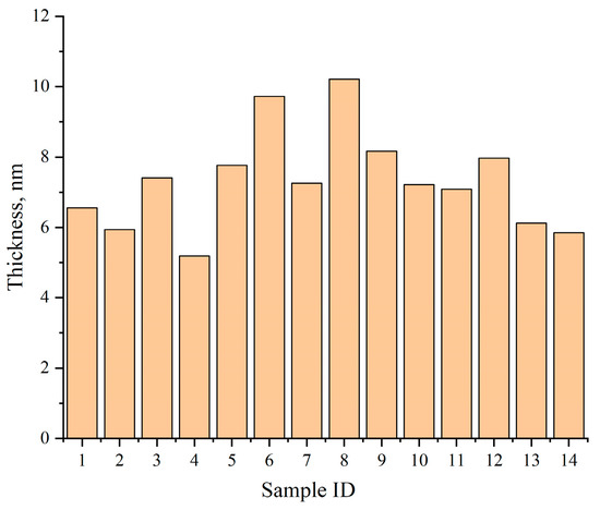 Figure 13 summarizes the average shell thickness values across 14 held-out test samples, with results ranging from 5.18 nm to 10.21 nm. Compared with manual measurements, the deviation of the automated results remains within 5%, validating the method’s accuracy.