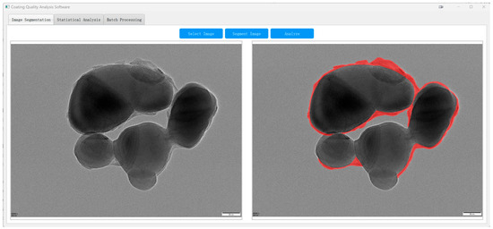 To demonstrate the practical utility of our method, we deployed the proposed TD U-Net–based pipeline as a standalone software module and applied it to assess the shell quality of a commercial TiO2 product (CR350) produced at a vanadium–titanium magnetite steel plant.
