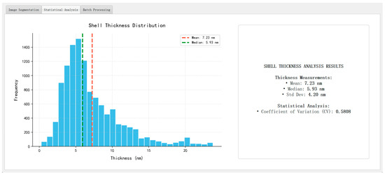 Figure 15 presents representative analysis outputs, including a log-normal particle size distribution (dominant range: 20–40 nm), a pseudo-color map of shell thickness, and a summary panel reporting key morphological statistics such as mean particle size, average shell thickness, standard deviation, and coefficient of variation (CV). The thickness values are computed using the skeleton-based method introduced in Section 3.6, with physical unit conversion achieved via the scale-bar recognition module described in Section 3.8.