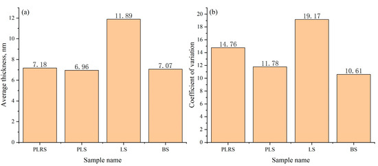 Comparison of average shell thickness (a) and Coefficient of variation (b) across four sample types. This figure assesses robustness/QA; no physico-chemical comparison is intended or implied.