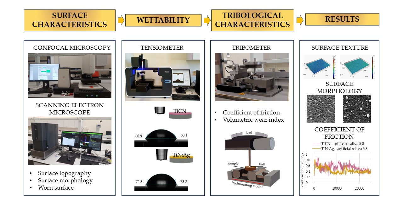 | 3.3. Tribological Properties and Assessment of Surface Geometric Structure After Tribological Tests | TRB3 tribometer (Anton Paar, Baden, Switzerland) | sample shape: disc, Ø 18 mm, motion: reciprocating, load and cycle: 1 N, 25,000 amplitude and frequency: 10 mm, 1 Hz countersample: Al2O3 ball, diameter 6 mm lubrication: artificial saliva 5.8 and 6.8 |