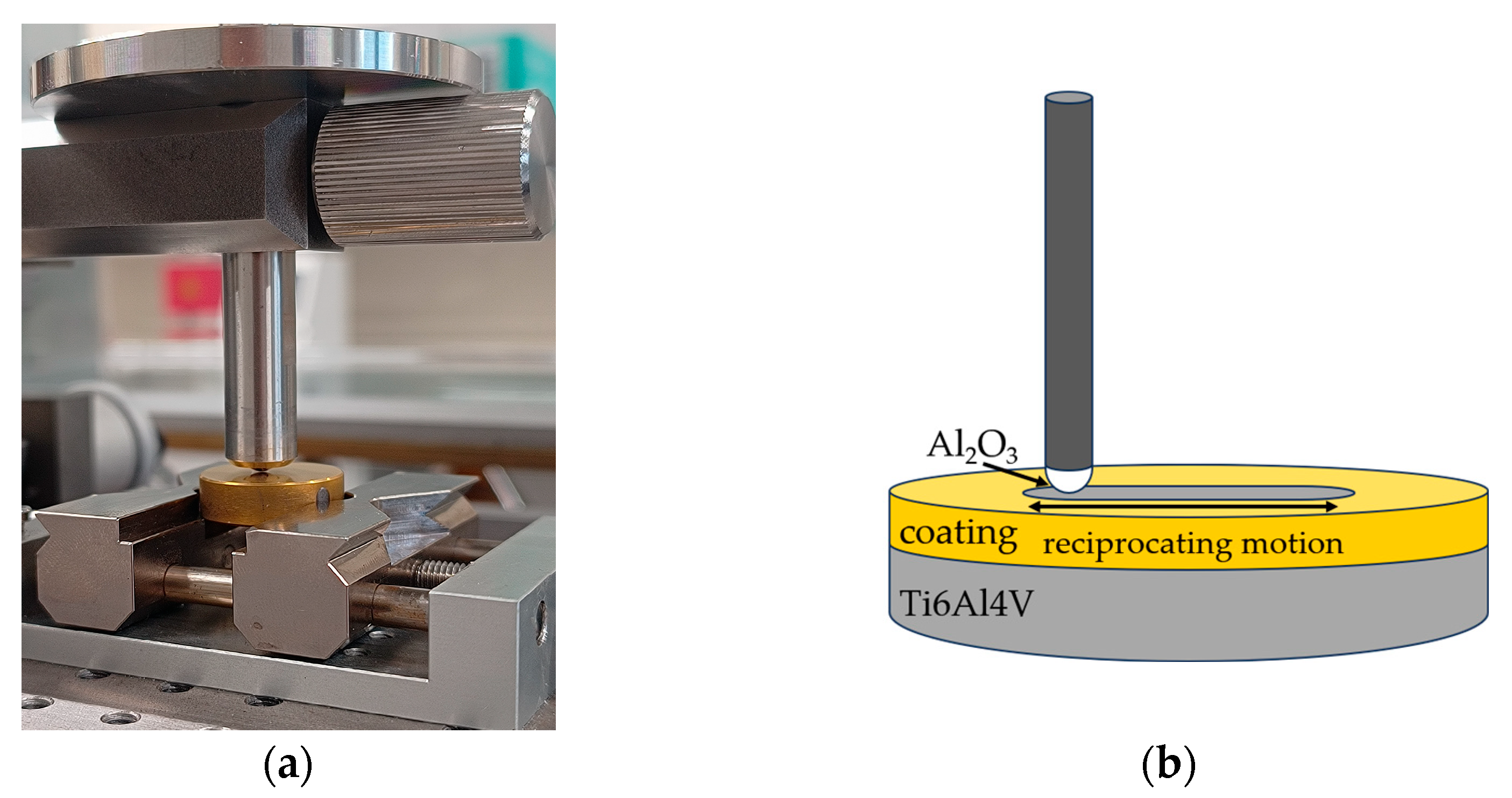 - Basha, M.M.; Ch Murthy, T.S.R.; Paul, B.; Sahu, A.K.; Sankar, M.R. Experimental investigation on dry sliding wear characteristics of additive manufactured titanium alloy features with various carbide balls. Tribol. Int. 2026, 213, 111029. [Google Scholar] [CrossRef]