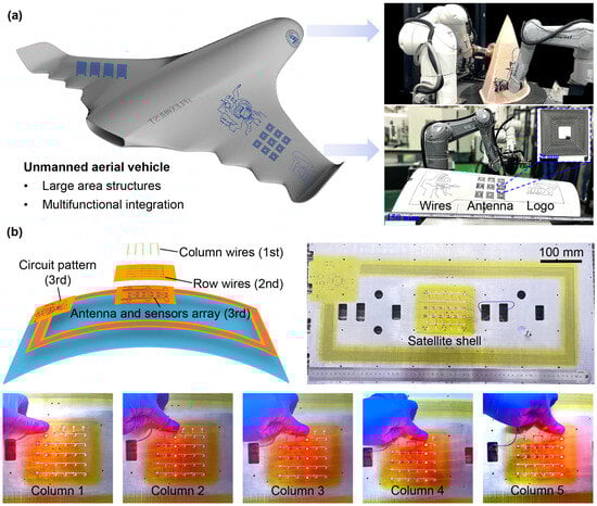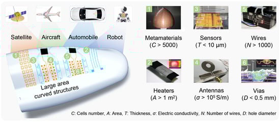 Large-scale conformal electronics have garnered significant attention due to their exceptional performance and adaptability. For instance, the “Wing of Tomorrow” project by Airbus integrates embedded sensors to continuously monitor the structural health of large-area curved wing structures. Large-scale conformal electronics are integrated onto the curved structures of satellites [1], aircraft [2], automobiles [3], and robots [4,5,6], as shown in Figure 1a. The electronic devices on these structures encompass metamaterials [7], heaters [8], sensors [9,10], and antennas [11]. They are interconnected by wires [12] and vias [13]. Large-scale conformal electronics pose challenges to the electrical performance and geometric accuracy of manufacturing strategies. For example, electrothermal de-icing heaters on aircraft are larger than 1 m2 to cover the entire ice area of the wing [14]. The thickness of sensors on smart skin is less than 10 μm to allow for conformal mounting on curved surfaces [15]. The conductivity of antenna patterns should exceed to ensure radiation efficiency. The lead wires used for signal transmission may connect to thousands of sensors distributed throughout the aircraft, indicating a very large scale [2]. Furthermore, the diameters of via holes in multi-layer conformal electronics are less than 500 μm [13]. These fabrication indicators present a significant challenge for the fabrication and integration processes.