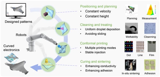 Compared to planar printing, conformal printing presents a multitude of unique challenges. The issue of droplet sliding on a curved surface frequently occurs and requires closer attention. Moreover, tasks such as positioning, substrate modeling, and printing speed planning become significantly more complex when dealing with curved surfaces. Consequently, the fabrication of large-scale curved electronics through conformal printing necessitates several critical components, as depicted in Figure 2. These components include precise positioning and trajectory planning to ensure conformal and stable motion, effective cleaning and treatment methods to enable droplet deposition without sliding, in situ sintering processes to enhance film conductivity, and advanced conformal printing techniques for fabricating high-resolution patterns. Here, a multi-robot EHD conformal printing strategy is proposed to deal with these complicated processes.