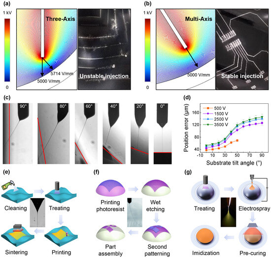 EHD conformal printing technology. Electric field and printed pattern of (a) three-axis conformal printing and (b) multi-axis conformal printing. (c) Droplet deposition behavior under different nozzle tilt angles. (d) Comparison of droplet deposition error under different substrate tilt angles and applied voltages. EHD printing process steps of (e) Direct-writing, (f) EHD lithography, and (g) Electrospray.