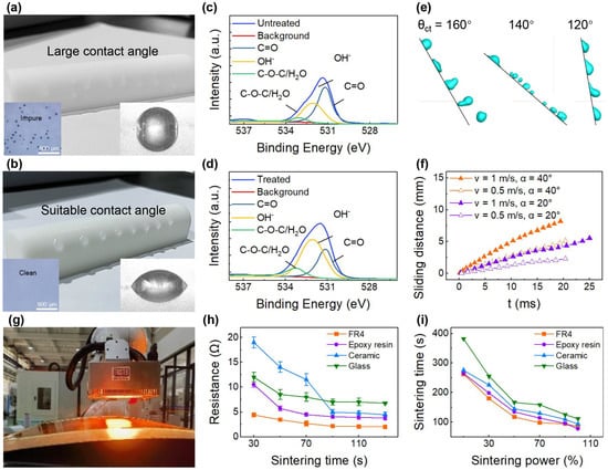 Surface wettability regulation and film sintering processes. Droplet deposition behavior on curved sufaces (a) before treatment and (b) after treatment. Comparison of surface properties (c) before treatment and (d) after treatment. (e) Droplet sliding behaviors of different contact angles. (f) Sliding distance under different impact velocities and the angles of inclination. (g) Film sintering by NIR lamp. The (h) resistance and (i) efficiency of NIR sintering on different substrates.