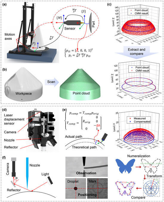 Measurement and positioning technologies. (a) On machine measuring system. (b) Measured point cloud data. (c) measurement accuracy verification (d) A home-made integrated smart printhead. (e) Principle of print height compensation. (f) Principle of vision observation and positioning.