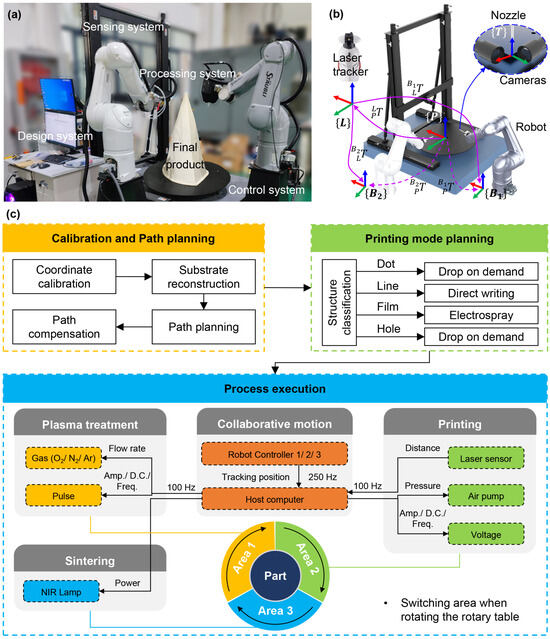 The high-quality implementation of multi-robot EHD conformal printing relies on four sequential and interconnected core stages, each addressing critical technical requirements to ensure precision, reliability, and performance of the final product. Initially, precise positioning and trajectory planning are essential. Maintaining stability in printing height is crucial for consistent jetting, which depends on an accurate trajectory. On-machine measurement technology is developed to ensure an accurate workpiece coordinate system. Laser and vision-combined positioning technology is employed for global and local positioning, and path compensation is introduced to eliminate motion errors. Subsequently, the substrate must undergo comprehensive cleaning and treatment to regulate surface wettability and eliminate impurities. This process is critical in controlling ink spreading during patterned droplet deposition and ensuring robust adhesion after post-curing. Plasma treatment is used as a method that can change wettability and eliminate impurities simultaneously. Following this, conformal printing entails the precise patterning of curved circuits using a robotized system that adheres to an optimized trajectory. This stage facilitates various conductive and dielectric patterns or films by utilizing multiple printing modes. It is essential in this phase to ensure jet stability by adjusting the printing parameters. EHD printing is adopted for its high resolution and multiple printing modes. Lastly, the metallization or solidification of deposited structures involves in situ sintering. This final process is instrumental in achieving the desired electrical and mechanical properties of as-printed patterns or films. NIR sintering technology is used because it is easy to integrate into the robotized printing systems.