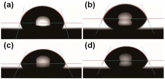 Image of the wettability test obtained using a goniometer. (a) HC—heat-cured resin; (b) BD—Bio Denture; (c) CD—Denture Base Cosmos; (d) SP—Smart Print Bio Denture.