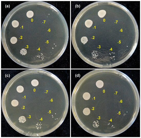 Figure 3 shows culture plates containing C. albicans growth from serial dilutions of 100 to 10−7, seeded in BHIA medium after incubation at 37 °C for 24 h to determine the number of CFU/mL.