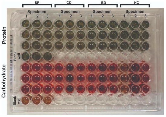 Triplicate quantification of extracellular matrix proteins and carbohydrates: HC—heat-cured resin; BD—Bio Denture; CD—Denture Base Cosmos; SP—Smart Print Bio Denture.