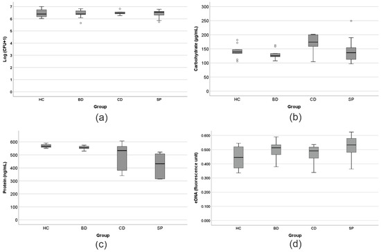 Characteristic of the C. albicans biofilm grown on the surface of different 3D-printed resins. (a) Microbial load (Log10CFU/mL; Kruskal–Wallis test); (b) amount of carbohydrate (µg/mL; Kruskal–Wallis test); (c) amount of protein (ng/mL; Kruskal–Wallis test); (d) quantification of the eDNA (fluorescence units; one-way ANOVA). ⸰ outliers. HC—heat-cured resin; BD—Bio Denture; CD—Denture Base Cosmos; SP—Smart Print Bio Denture.