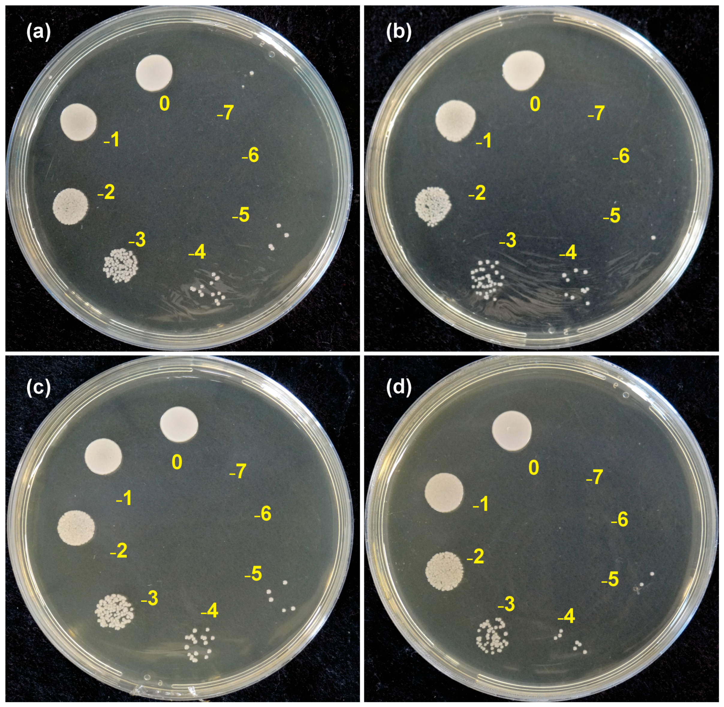 2.6. Determination of the Colony-Forming Units (CFU/mL)