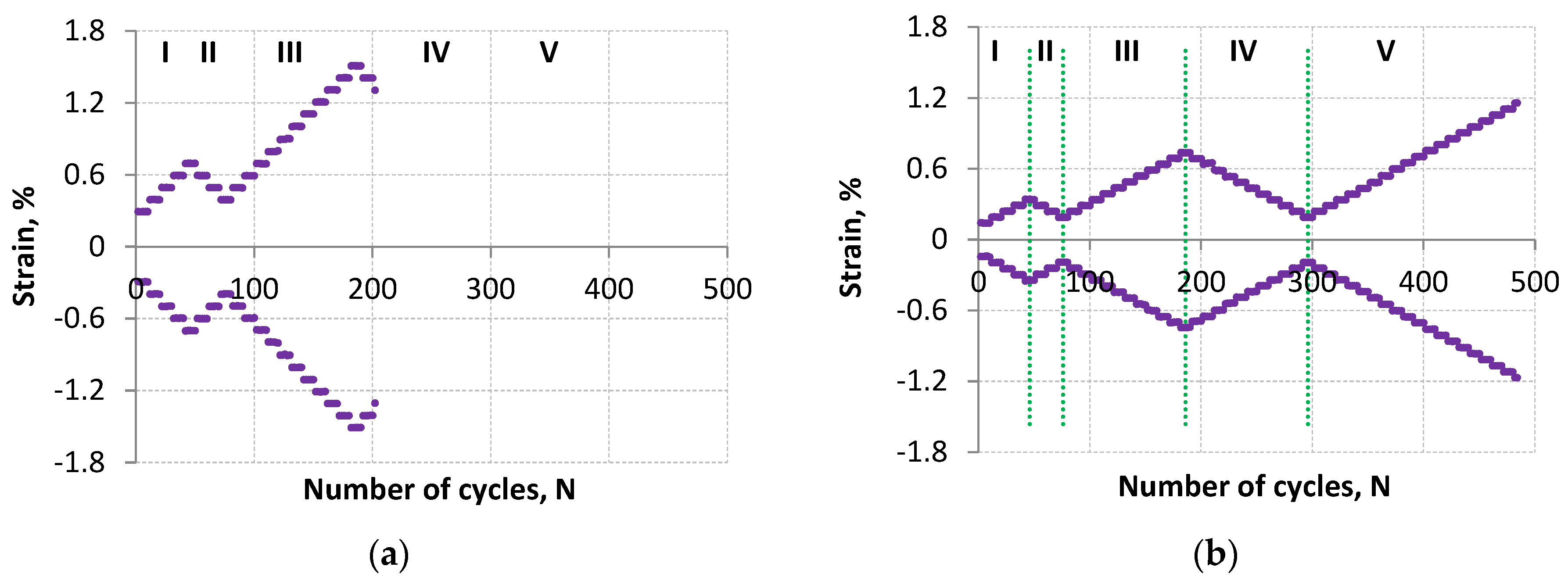 As demonstrated in the above analysis, the tested material has cyclically unstable material properties. At lower levels of the control variable, periods of cyclic material weakening prevail, while at higher levels of the control variable, periods of cyclic hardening predominate. Due to this, describing the material properties through conventional analytical equations such as the Ramberg–Osgood model using n’ and K’ [
