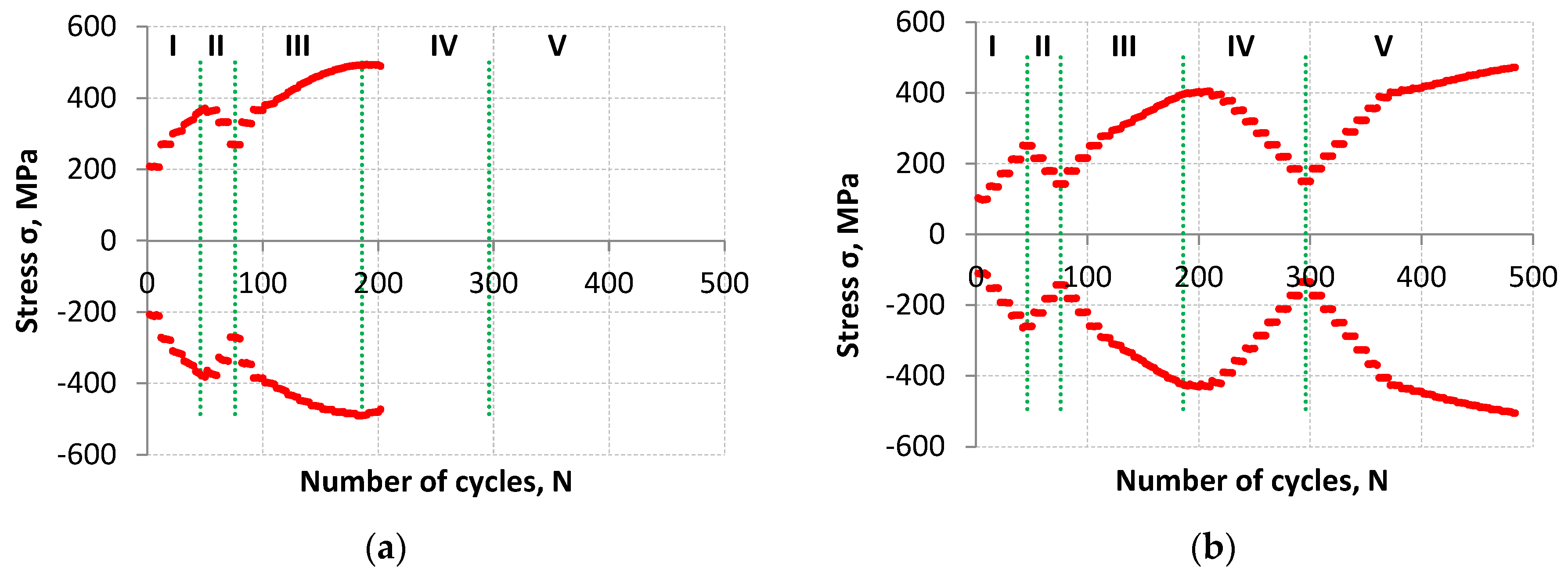 Figure 5a,b). The change in this behavior begins to be observed before exceeding the hundredth loading cycle for LFL and after exceeding the four hundredth cycle for HFL. At that point, the mean stress value began to increase from −10.39 to 7.97 MPa for LFL and from −17.57 to −16.43 MPa for HFL regardless of whether successive load cycles were increasing (as observed for HFL) or decreasing (as observed for LFL). After passing the four hundredth cycle for HFL, the increase in the mean stress value was negligible and amounted to more than 1 MPa while for LFL the change was significant and amounted to as much as 18.36 MPa.