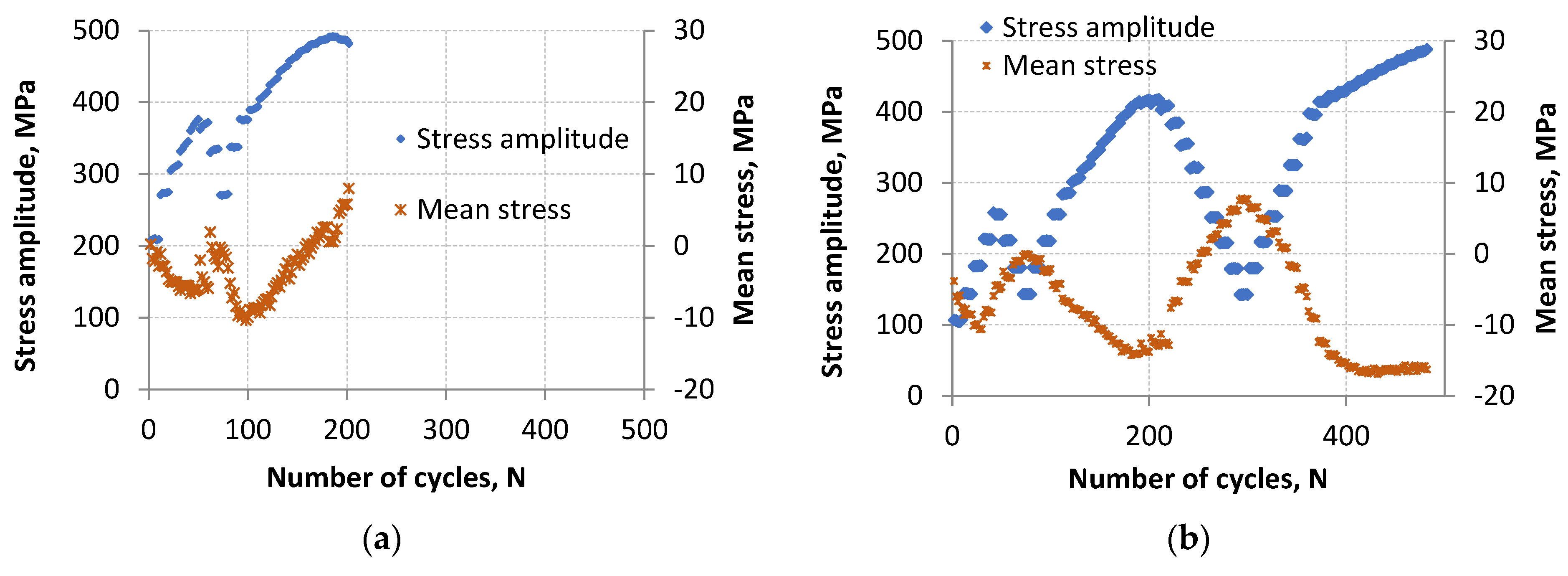 The behavior of mean stress values was also analyzed. Graphs of mean stress and stress amplitude as a function of the number of cycles are shown in