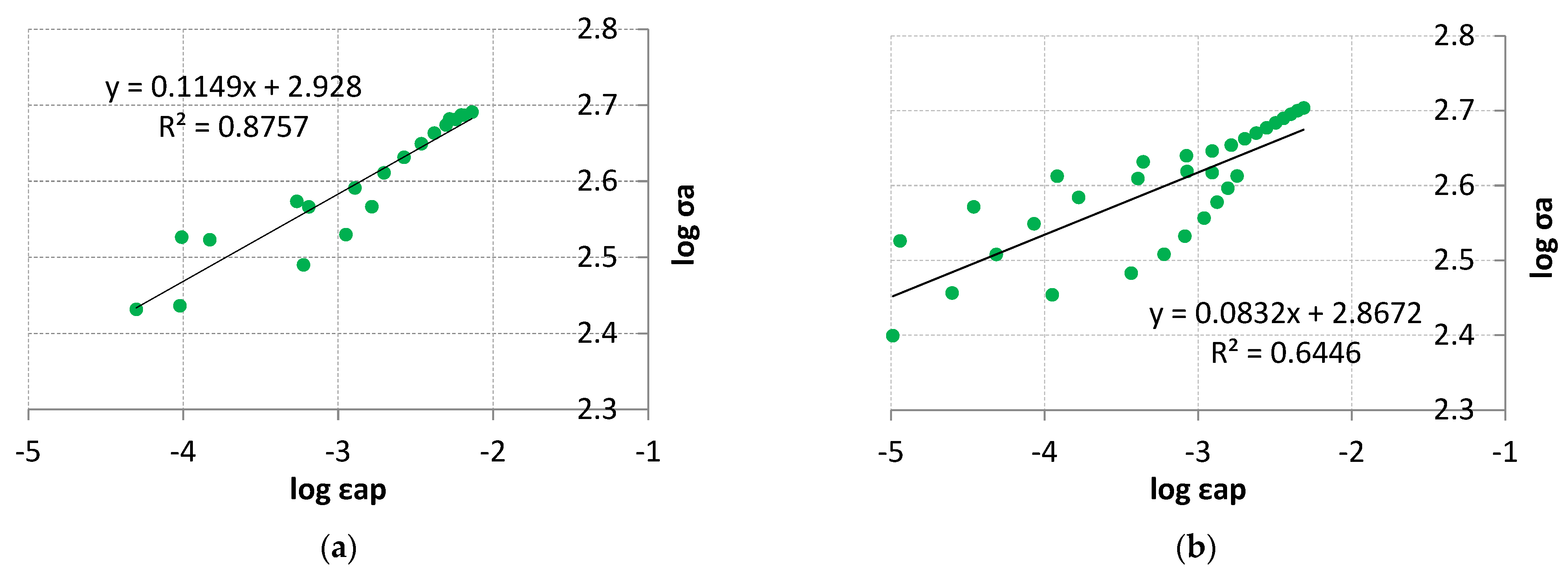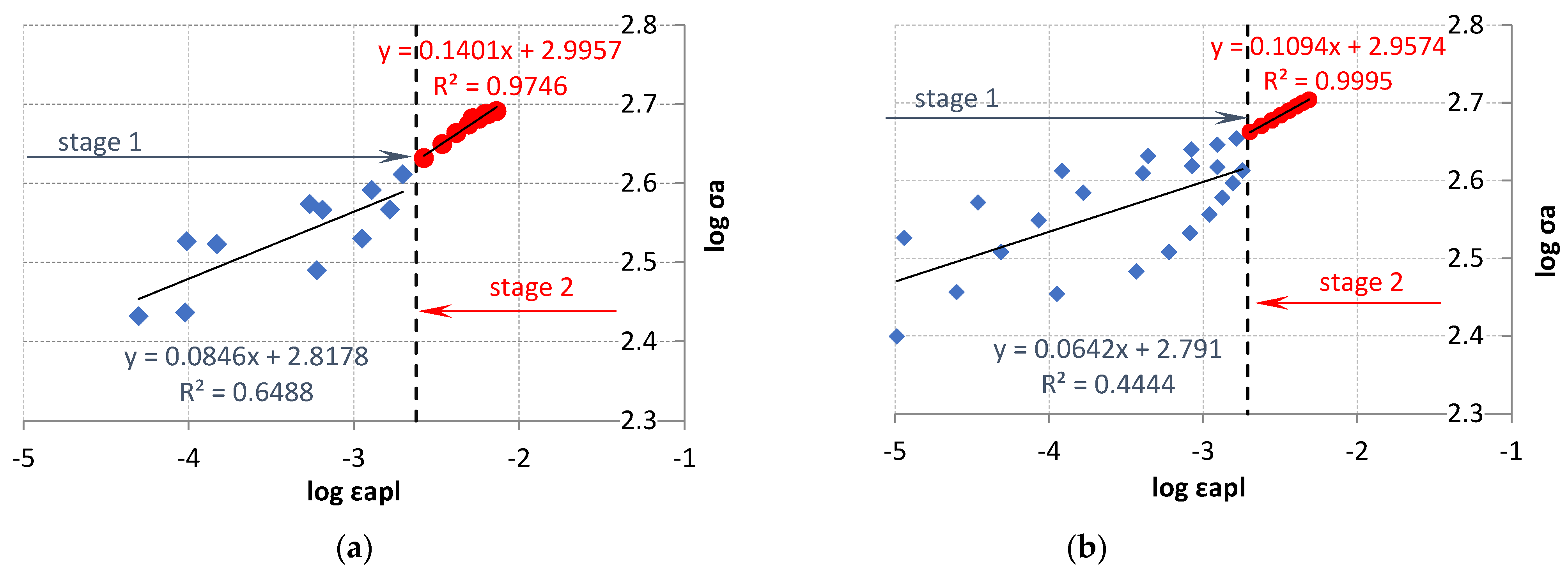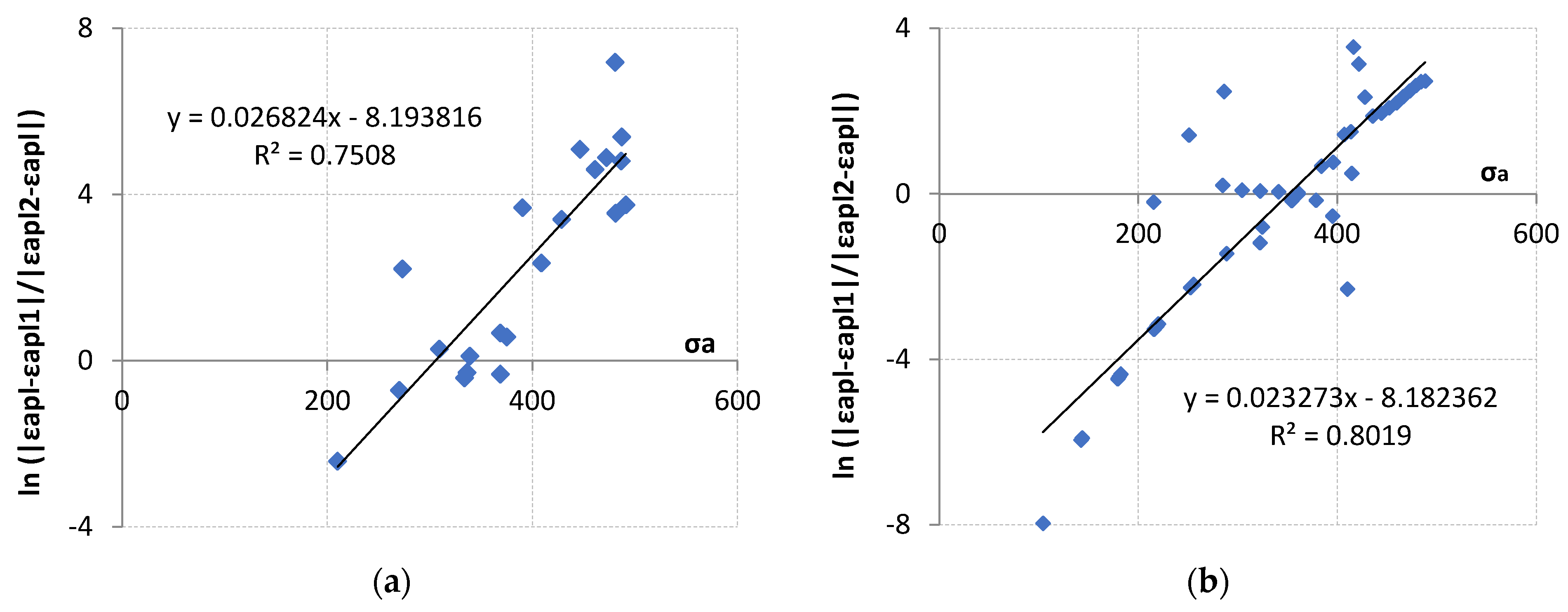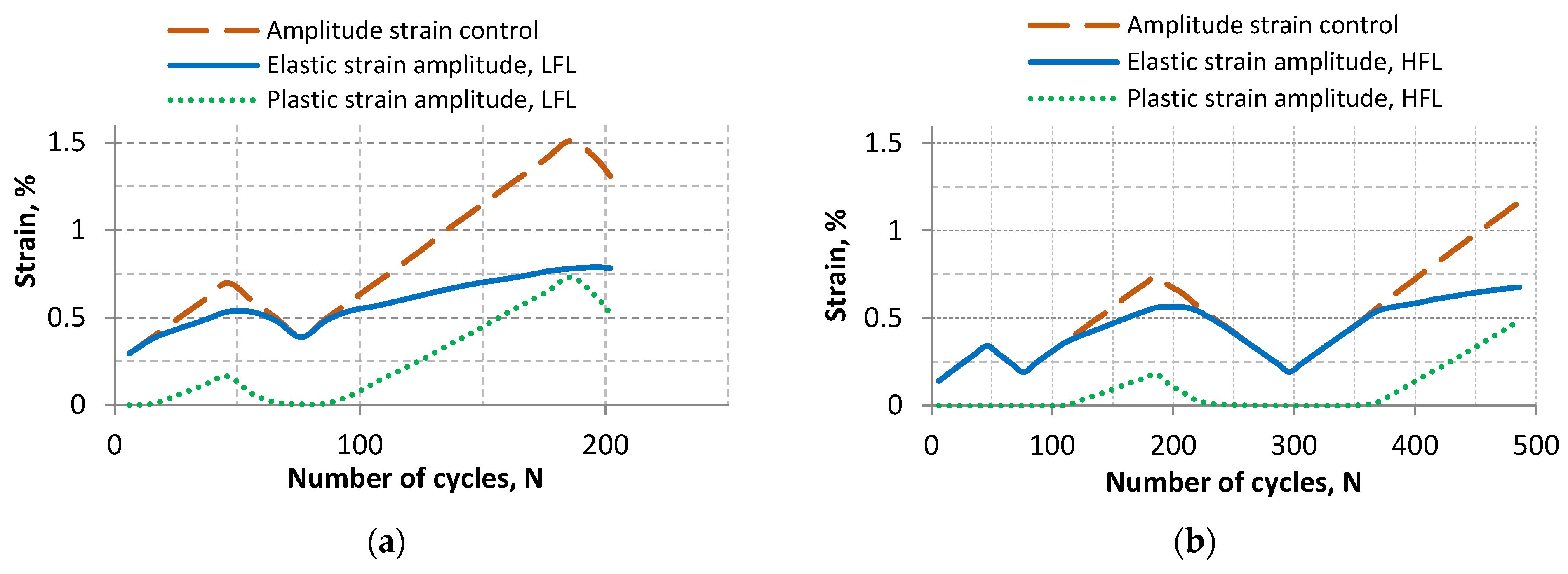 a). The coordinates of these points are also similar and are (0.3135, 0.9612) and (0.2676, 0.8944) for LFL and HFL, respectively. Thus, taking into account the entire life of the tested items and looking at the formulas of the obtained straight lines, it can be concluded that, independent of the fatigue life result (which depends mainly on the value of the control amplitude), the selected value of the control variable will correspond to a specific plastic strain value comparable for the LFL and HFL tests.