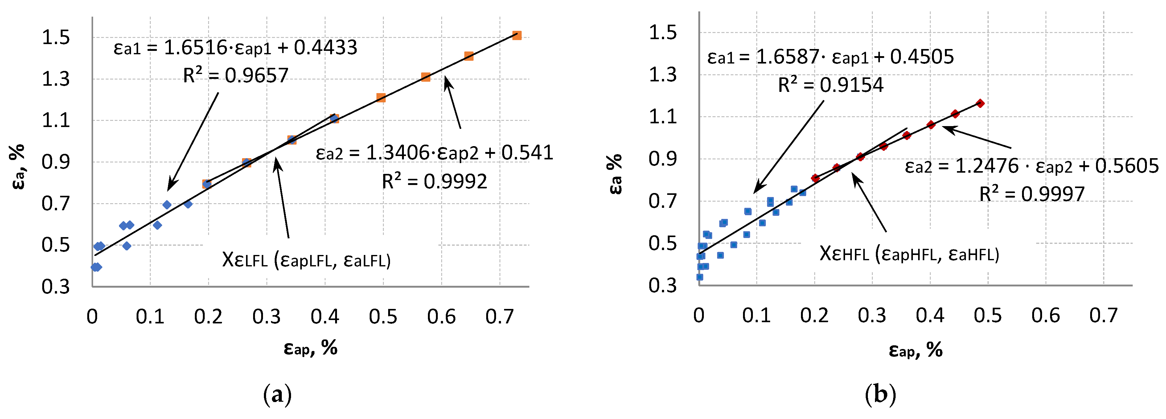 An attempt was also made to describe the test results using two linear correlations. The value of εapX calculated from the mean value derived from the intersection points of XεLFL/HFL, XELFL/HFL_R, and XELFL/HFL_U was used as a criterion for dividing the experimental test results. These values amounted to εapXLFL = 0.2382% for the LFL test and εapXHFL = 0.1943% for the HFL test, respectively.