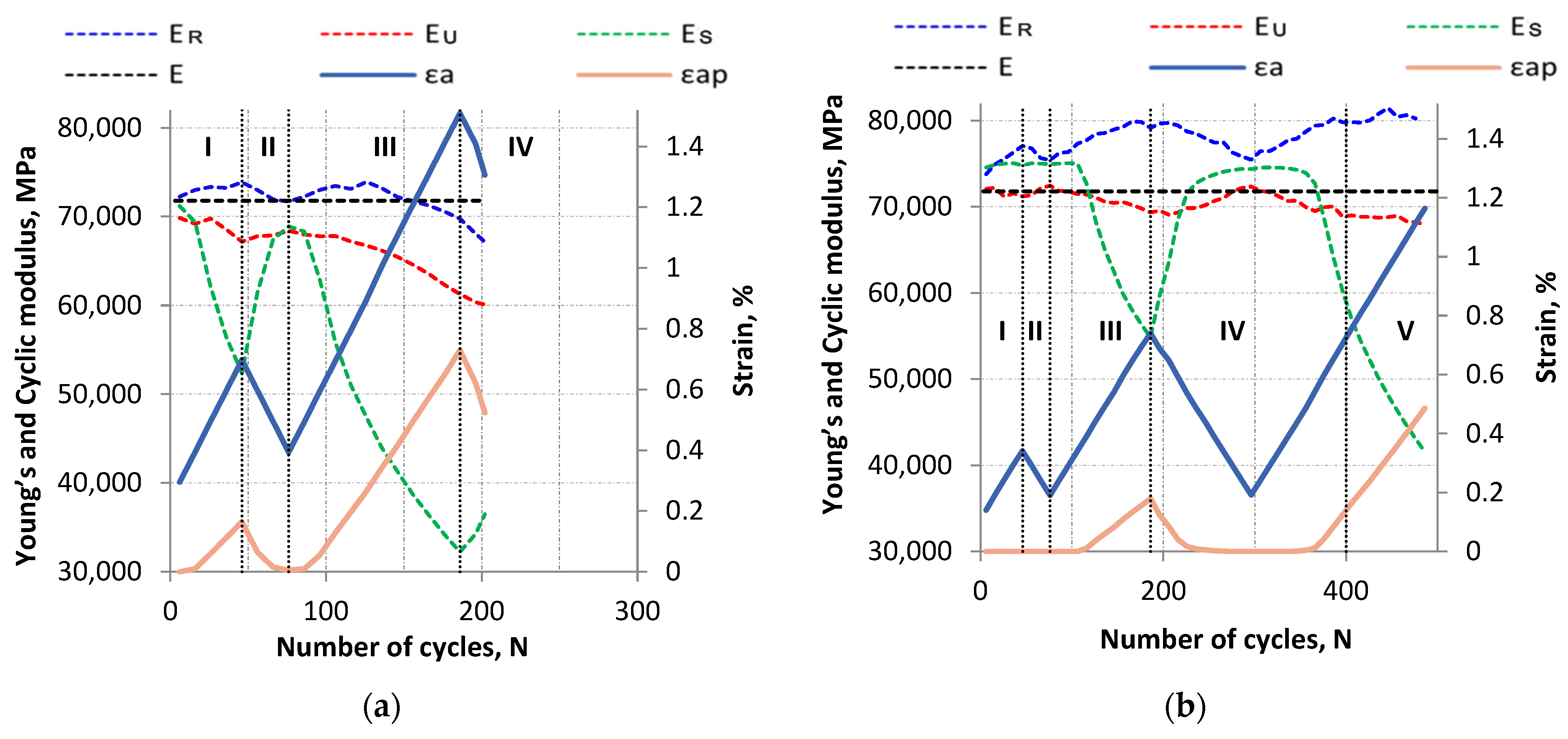 Figure 10 presents the summary of cyclic moduli as a function of the increasing number of cycles N. For comparison,