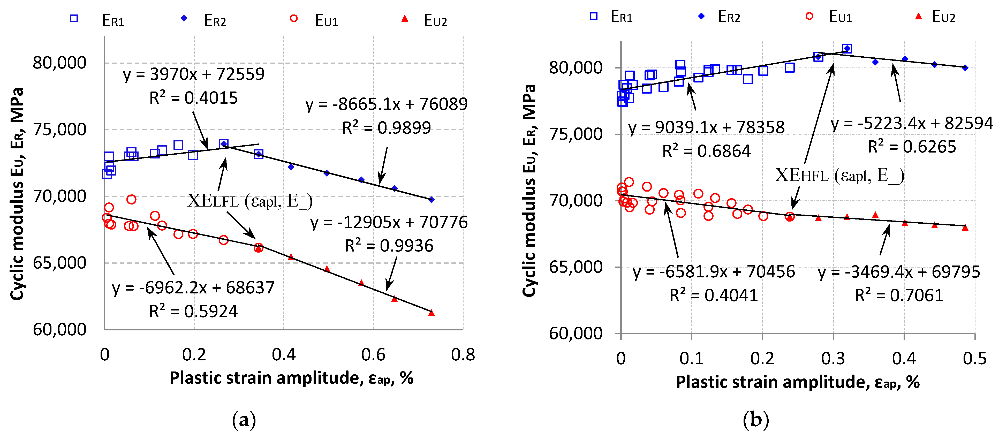 Figure 11). The results of each cyclic modulus were described by two linear regressions, and the intersection of these regression lines was denoted by the XE