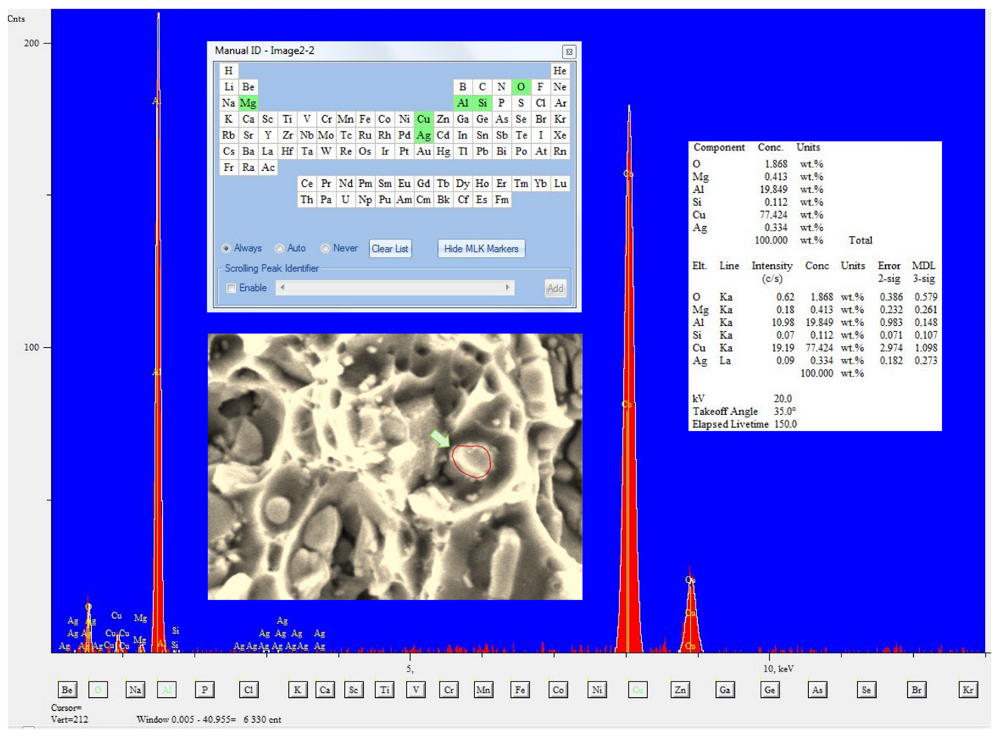 Figure 16) is of transcrystalline plastic character with sparse intercrystalline cracks present. A feature common to the analyzed fracture in this area is the occurrence of characteristic faults penetrating deep into the material. They most likely occur between individual layers of the rolled plate. Facets are visible on the walls of these cracks, and (at slightly higher magnifications) voids and micro-cracks are discernible. Particles of undissolved θ-phase are visible at the bottom of the dimples, as evidenced by the result of the chemical composition analysis of the fragment containing the said particles, the spectrum of which is shown in