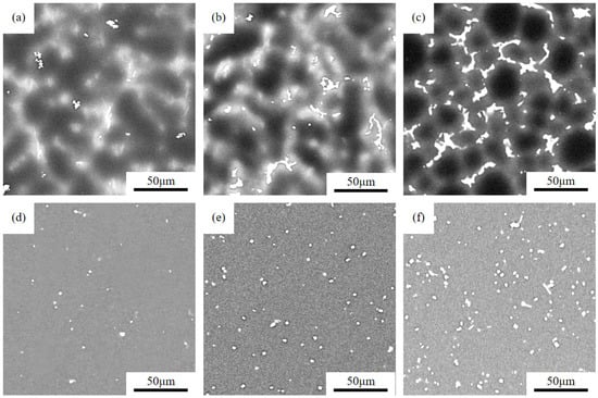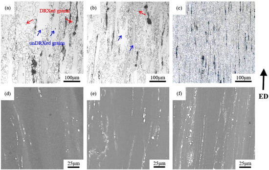 In addition, black strip-like structures were observed in the hot-extruded alloys, distributed in a streamline pattern along the hot extrusion direction, as indicated by the black arrows in Figure 3a–c. This is because during the hot extrusion process, the undissolved eutectic phases were crushed into numerous intermetallic particles, which aligned along the extrusion direction. These features are more clearly visible in the SEM micrographs of Figure 3d–f.