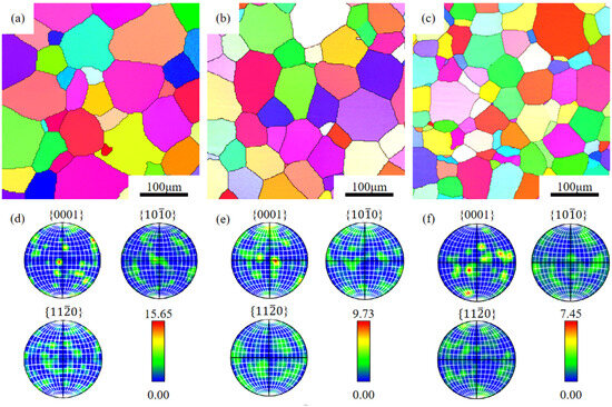 IPF maps (a–c) and the corresponding PF maps (d–f) of the solid-solution Mg-xGd-4Y-1Sm-0.5Zr alloys. (a,d) x = 4; (b,e) x = 7; (c,f) x = 10.