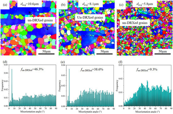 Figure 4a–c show the inverse pole figure (IPF) maps of the hot-extruded alloys along the extrusion direction (ED). It is evident from the figures that the degrees of DRX vary among the three hot-extruded alloys. The GWS441 alloy exhibits the lowest DRX degree, with the fractions of un-DRXed regions measured to be approximately 46.3%. With the increase in Gd content, the proportion of low-angle grain boundary (LAGB) decreases, the residual dislocation decreases, and the degree of DRX increases gradually. The hot extruded GWS1041 alloy undergoes almost complete DRX, with the proportion of un-DRXed grains decreasing to 9.3% (Figure 4d–f). Obviously, the proportion of un-DRXed regions decreases with the increase in Gd content. In other words, the higher content of the Gd element is beneficial for promoting the DRX of the Mg-xGd-4Y-1Sm-0.5Zr alloy during the hot extrusion process. The average grain sizes of hot-extruded GWS441, GWS741, and GWS1041 alloys are 10.6 μm, 8.1 μm, and 5.8 μm, respectively.