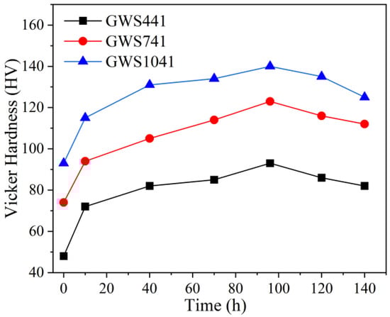 For Mg-Gd-Y-Zr series alloys, the aging temperature is typically in the range of 175–250 °C [30]. Previous studies by our research group have revealed that the age-hardening effect of hot-extruded Mg-xGd-4Y-1Sm-0.5Zr alloys is more significant at 200 °C. The age-hardening curves of the three hot-extruded alloys are shown in Figure 5. The hardness of all three alloys initially increases and then gradually declines as the aging time extends. It is evident that after 96 h of aging, all three alloys reach their hardness peaks, and as Gd content rises, the peak hardness also progressively increases. The microstructural characteristics of the three peak-aged alloys are selected for HADDF-STEM analysis in Section 3.3.2.