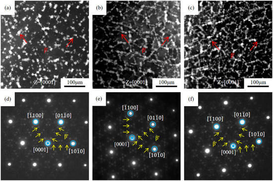 In addition to the β′ phase, there are some hexagonal precipitates in the three peak-aged alloys, which are distributed between β′ precipitates in the white rectangle of Figure 8a–c. Zhou et al. [37] found that this “tentacle” precipitate is the β″ phase, which precipitates along the direction, which is conducive to the precipitation of Gd atoms. Matsuoka et al. [38] believed that the crystal orientation of the β″ phase is related to the orientation of the β′ phase. Xie et al. [39] analyzed the evolution of aging precipitation of Mg-Gd-Y alloy, found that the β″ phase would change into the β′ phase during isothermal aging, and established a transformation model, pointing out that the β′ phase is to reduce elastic strain and achieve faster growth through the β″ phase with a lower nucleation barrier. It can also be found that the β′ phase is formed along the crystal direction, in the rectangular region of Figure 8b, which also shows that the β′ phase is transformed from these “tentacle” structures. The research shows that both β″ and β′ phases belong to mainly strengthening phases in Mg-Gd-Y series alloys [40,41,42].
