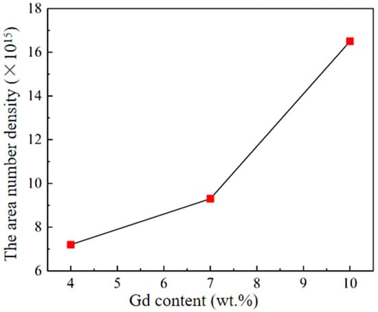 It is obvious that the area number density of the β′ phase increases with increasing Gd. It can be inferred that the β′ phase is composed of Gd-rich components in the specimen, which resulted in higher precipitate density with the increase in Gd content. Wang et al. [35] studied the binding value of stable phases formed between Mg-Mg, Mg-Y, Mg-Gd, Gd-Y, and Gd-Gd atoms in the Mg-Gd-Y alloy. The results showed that the Gd-Y clusters are preferentially formed at the beginning of aging treatment, and these clusters would be transformed into the β′ phase. Because of increasing Gd content, the quantity of Gd-Y clusters increases, and the area number density of β′ precipitates also increases. This result is similar to that of Rong et al. [36], with Gd content increasing, the area number density of β′ gradually increases.