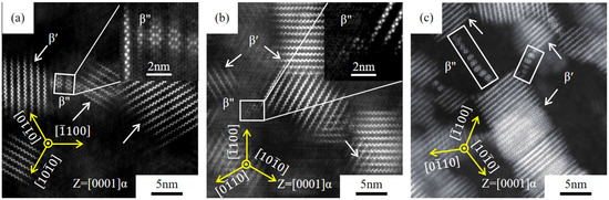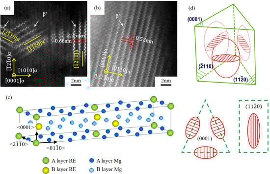 Figure 9a,b also shows that the β′ phase precipitates in the , and crystal planes. The HAADF-STEM image at the axis shows that the β′ phase is in a long strip shape, and the long axis is parallel to . Figure 9d shows the distribution diagram of the β′ phase in these crystal planes, and it is evident that the β′ phase is distributed in a disk shape. Research believes that the disk-shaped phase precipitated in cylindrical grain planes of the Mg alloys has the greatest blocking on slip, which could significantly improve the precipitation strengthening [43].