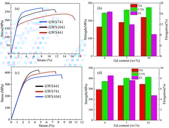 Tensile stress–strain curves and corresponding mechanical properties of hot extruded state (a,b) and peak aged state (c,d) Mg-xGd-4Y-1Sm-0.5Zr alloys.